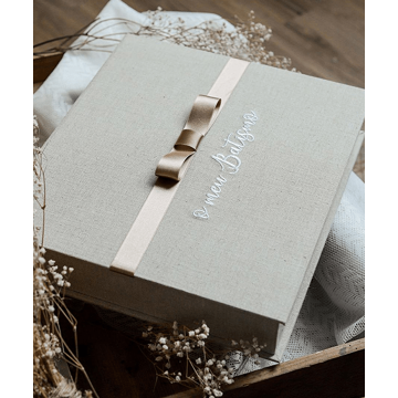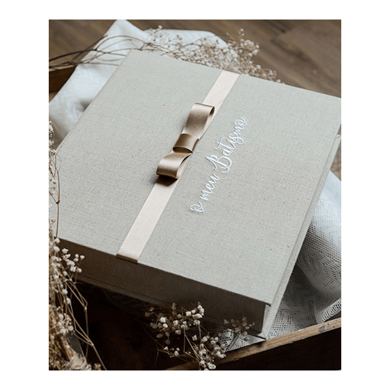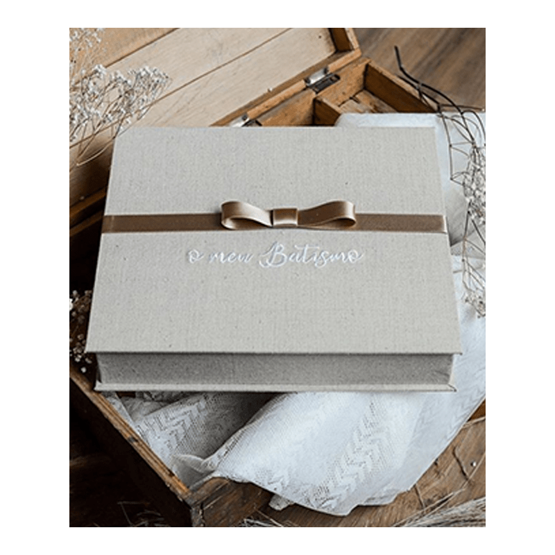 Caixa com laço e bordado “O Meu Batismo” para guardar a vela, a tolha e a concha do Batismo do seu filho