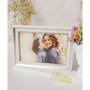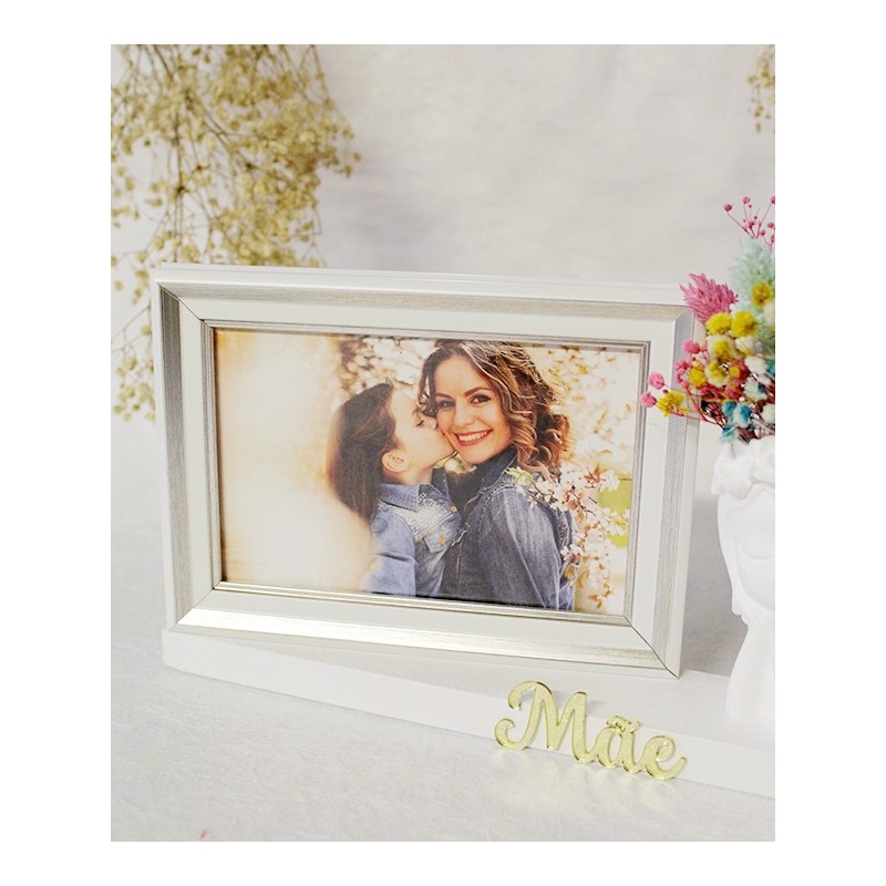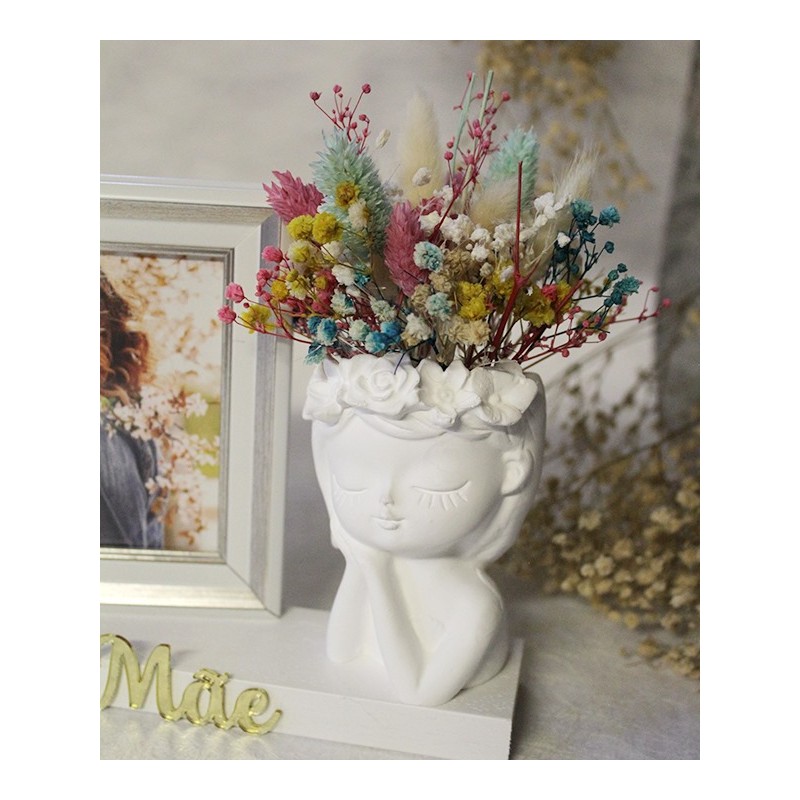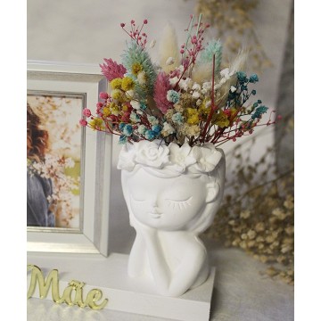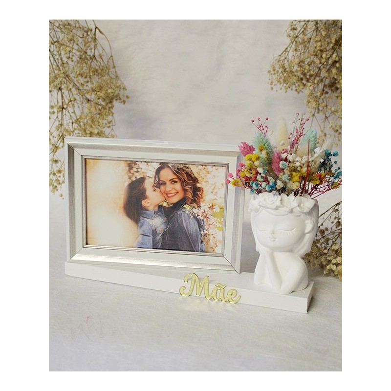 Base em madeira branca com busto com flores artificiais e moldura para fotografia 10x15cm.