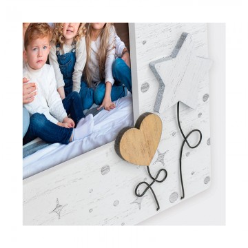Moldura de mesa, de cor branca. Decorada com estrelas pintadas de prateado e casinhas, coração e estrela, em relevo.