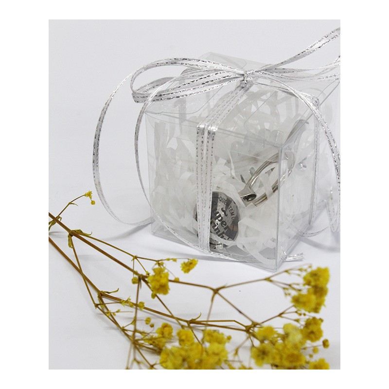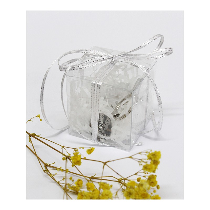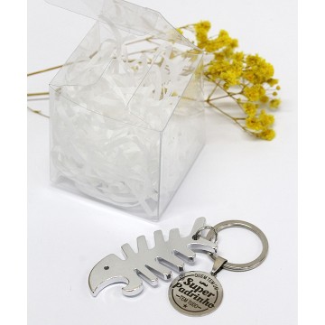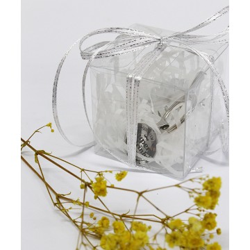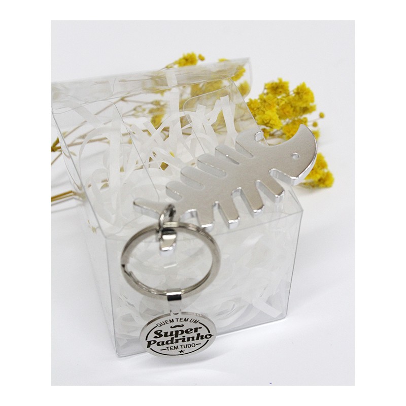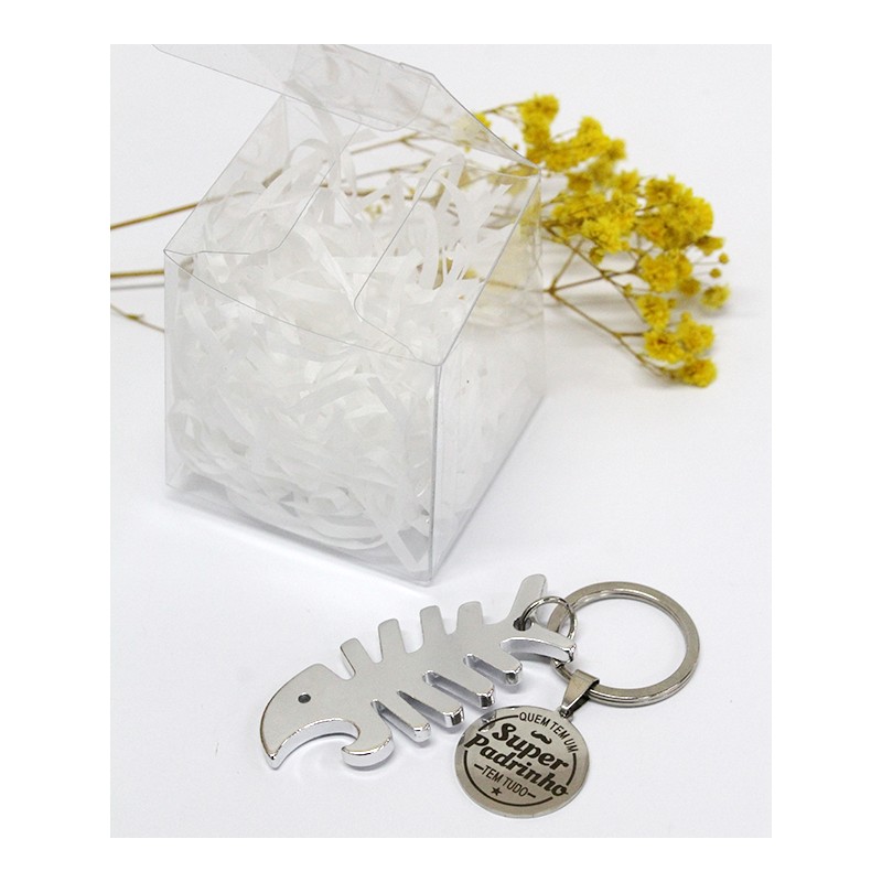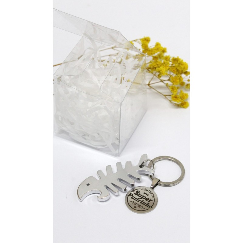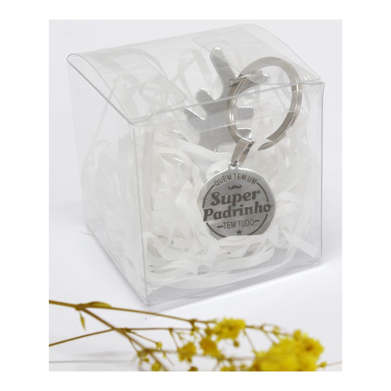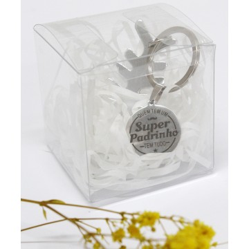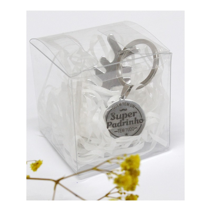 Caixa transparente com abre caricas e medalha com mensagem “Quem tem um Super Padrinho tem tudo”