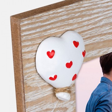 Moldura em madeira natural, decorada com coração branco.