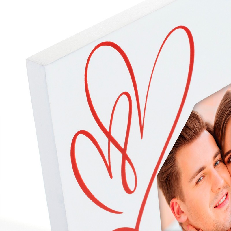 Moldura em madeira branca, horizontal, decorada com corações vermelhos e glitter.