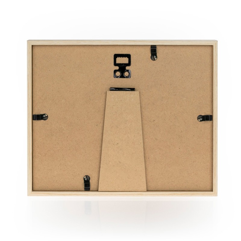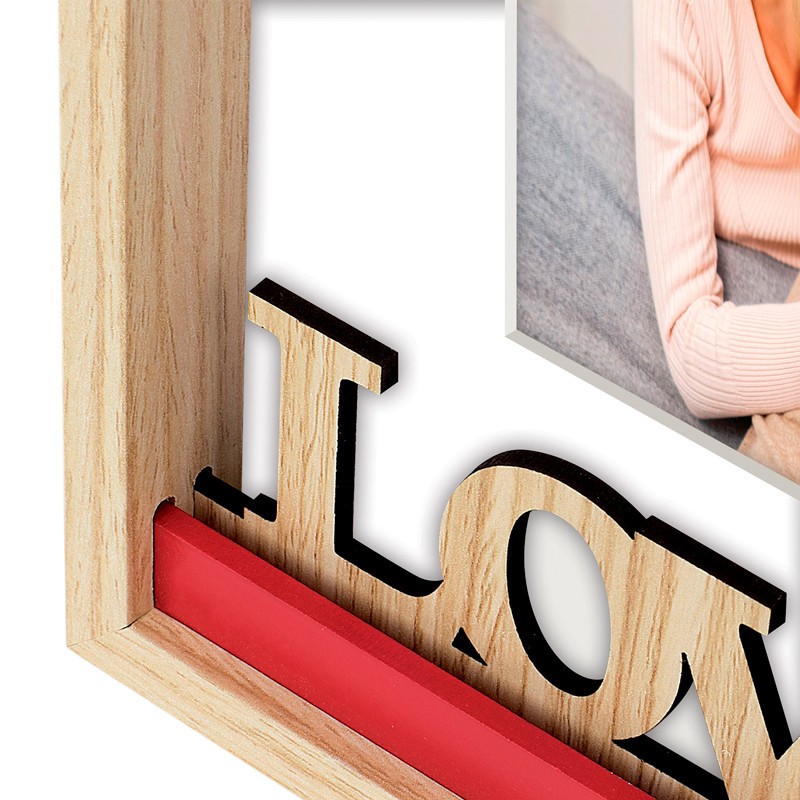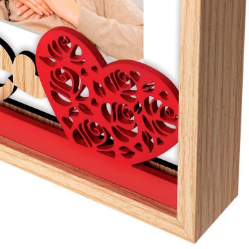 Moldura em madeira branca e castanho natural, decorada com "Love" e coração perfurado.